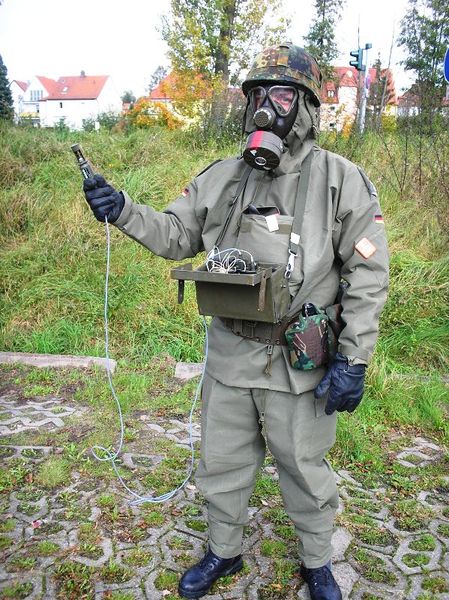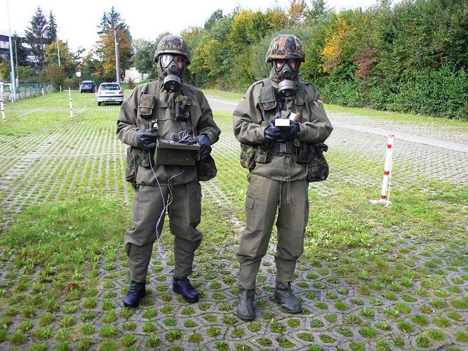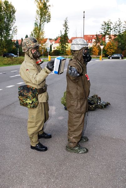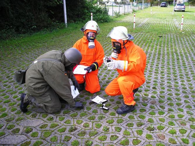 Der Einsatz als A-Spürtrupp bzw. als C-Spürtrupp, die Abfassung von Spürmeldungen und die Weiterverarbeitung in der Lagezentrale wurden praktisch geübt. Hier stellte sich dann doch heraus, dass die Bedienung der Geräte - im Trockentraining immer sehr einfach - unter ABC-Schutz mit Overgarment und Handschuhen doch wesentlich schwieriger ist.
