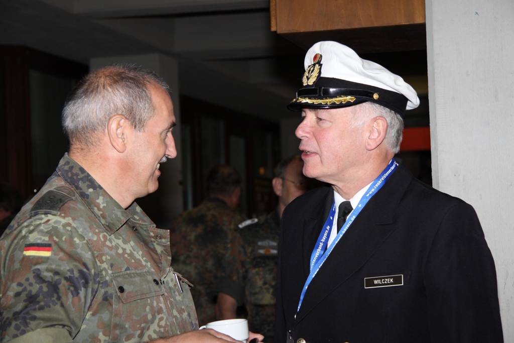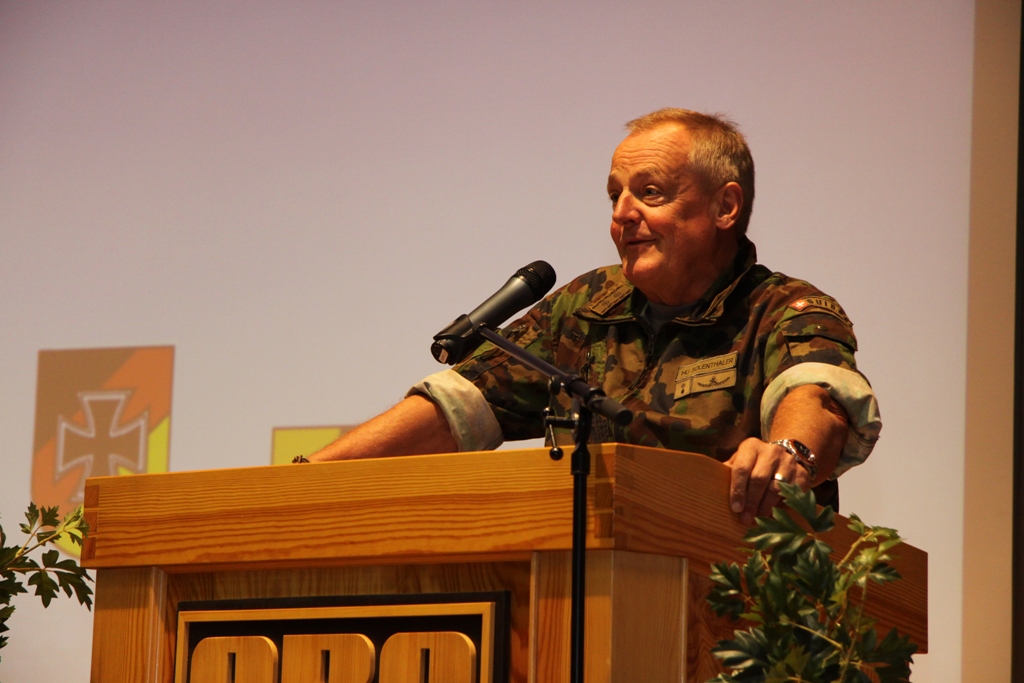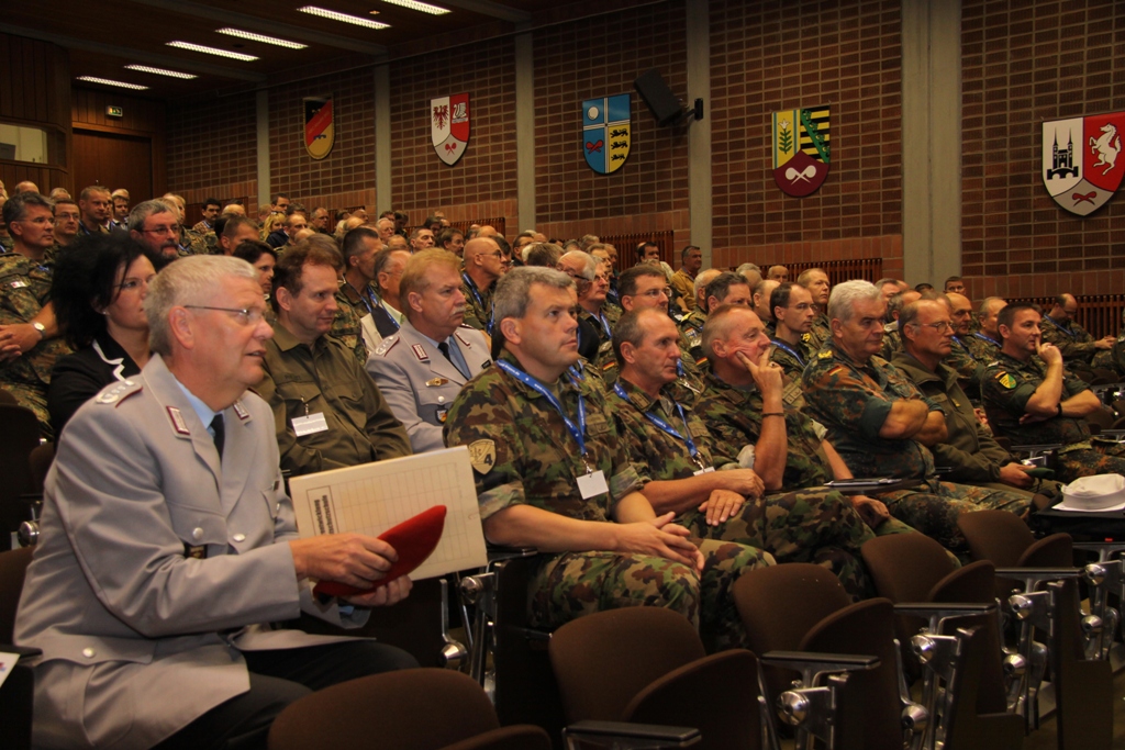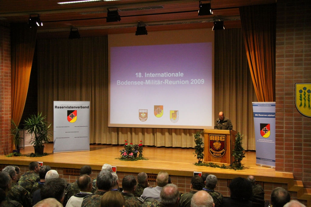 Mittelpunkt der Veranstaltung war in diesem Jahr die grenzüberschreitende Information und der Erfahrungsaustausch. Gerade Katastrophen zeigen deutlich, dass sie vor Grenzen nicht halt machen und eine militärische Zusammenarbeit erforderlich ist. Als zentrales Thema der Bodensee Militär-Reunion hatten die Verantwortlichen deshalb die Hilfe bei Katastrophen durch Reservisten und aktive Truppe gestellt. In seinem Vortrag stellte Brigadegeneral Berger das System der zivil-militärische Zusammenarbeit in Süddeutschland vor. Dabei skizzierte er deren Aufgaben auf den unterschiedlichen hierarchischen Ebenen bis hinunter zu den Kreisverbindungskommandos. Ebenso ging Berger auf die Modellerprobung der regionalen Initiativen der Katastrophenhilfe bei Reservisten ein. Oberst d.R. Fried-Joachim Störmer, Leiter des Bezirksverbindungskommandos Schwaben, referierte über seine Arbeitsebene.