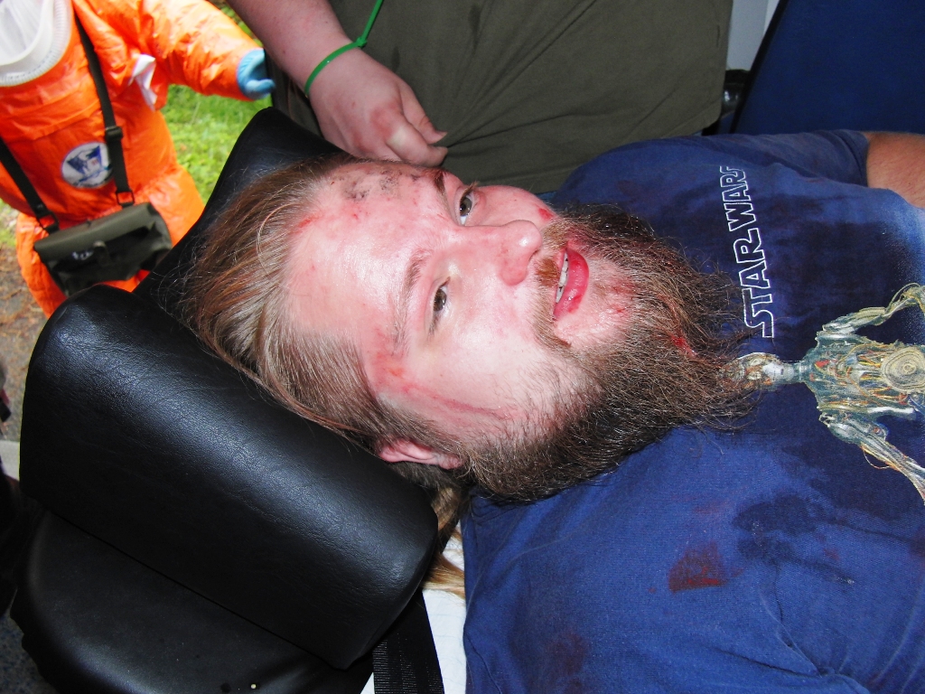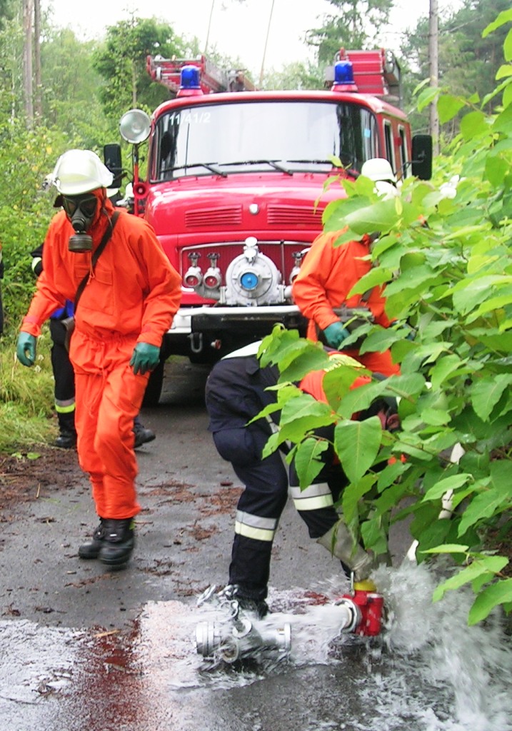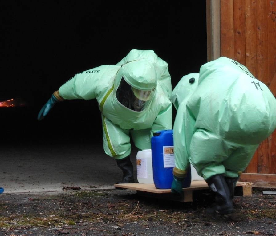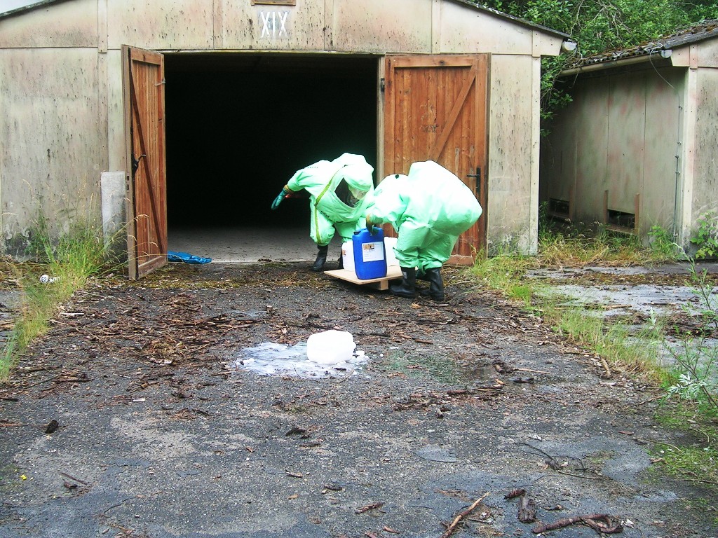 Zurück zum Ausgang: Eines Morgens kurz nach acht Uhr ziehen stechend riechende Dämpfe aus dem Waldstück bei Langlau auf den Ort und das Naherholungsgebiet Brombachsee zu. Um 08.30 Uhr ging in der Notrufzentrale die Meldung ein, dass Fässer mit Chemikalien in Brand geraten sind. Die örtlichen Feuerwehren wurden zur Absicherung und der Gefahrgutzug der Feuerwehr Weißenburg wurde zum Einsatz an der Schadensstelle alarmiert. Beim Eintreffen kamen den Feuerwehrleuten zwei Arbeiter entgegen, die aus der Schadensstelle geflüchtet waren. Sie gaben die Meldung ab, dass neun weitere Arbeiter verletzt bei den brennenden Fässern liegen.