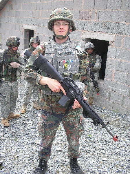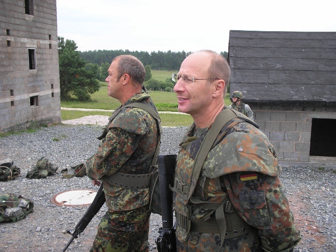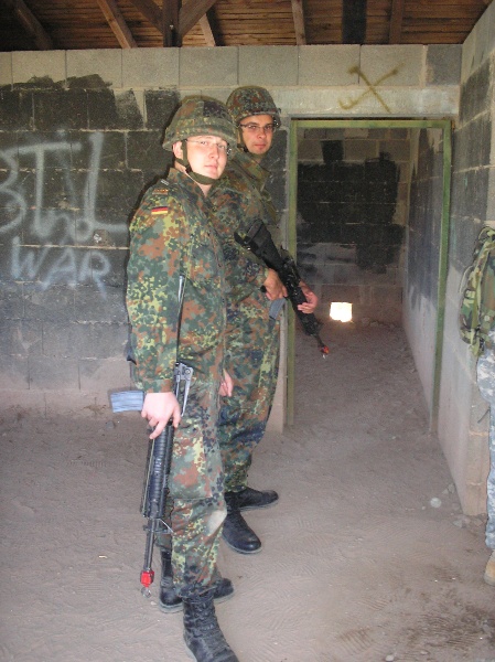 Der ehemalige Orts- und Häuserkampf hat sich in Zeiten von Stabilisierungseinsätzen doch deutlich verändert, auch das Vorgehen im Gebäude. Unsere Kameraden konnten bei der Basisausbildung unserer Pateneinheit dabei sein und den SOP (Standard Operation Procedure) der US Army kennen lernen. Für alle die dabei waren, zwar ein sehr anstrengender Tag, aber ein sehr lehrreicher Tag. Schon das dauerhafte Tragen des Splitterschutzes und des Gefechtshelmes war für viele gewöhnungsbedürftig, beim MOUT-Training im Gebäude aber mit einer ballistischen Brille jedoch Pflicht.
