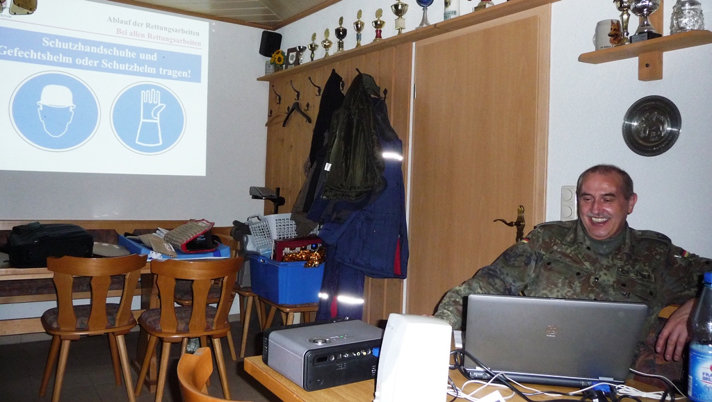 Die Ausbildung in Retten und Bergen von Verschütteten ist Bestandteil der Selbstschutzausbildung der Bundeswehr. Neben den einfachen Mitteln - wie Klopfzeichen und Rufen - kommen aber auch Suchhunde zum Einsatz, um Verschüttete zu orten. Zur Vorbereitung der praktischen Übung zum Retten und Bergen im Mai wurde ein Grundsatzunterricht zu den Rettungsverfahren und eine Einweisung im Suchen mit Hilfe von Rettungshunden durchgeführt.