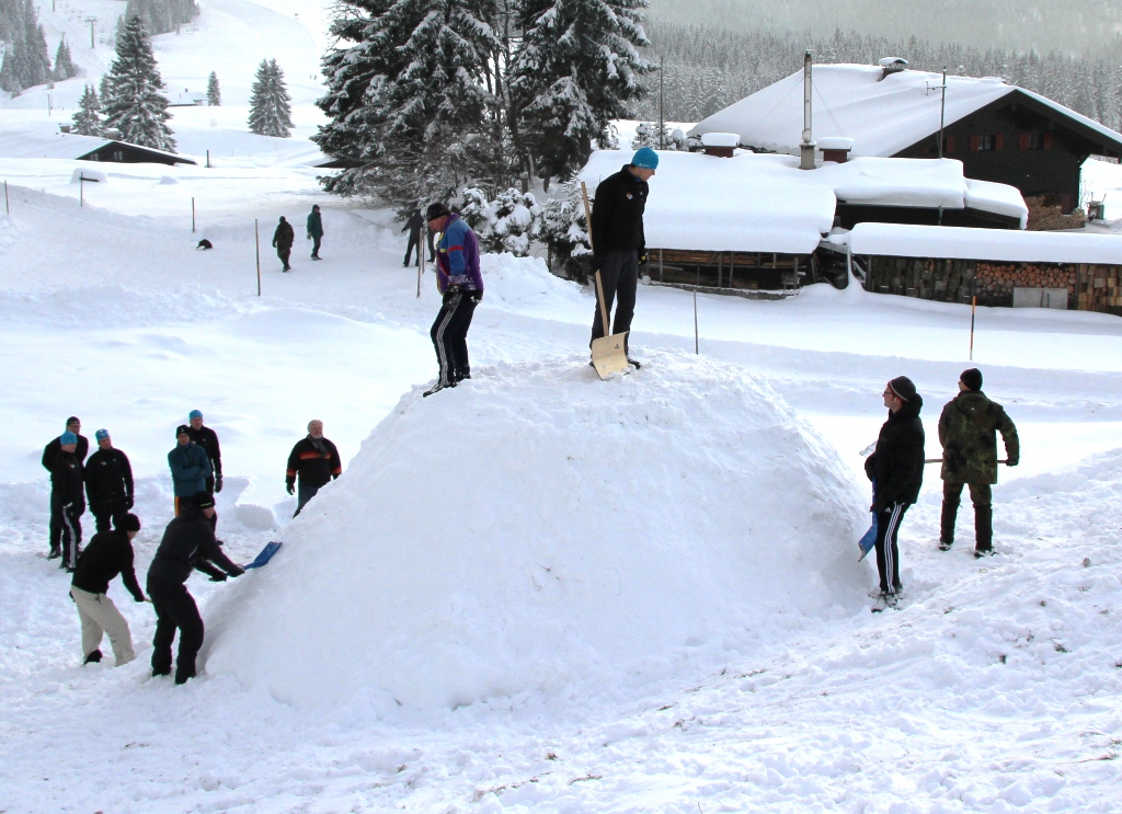 Den Höhepunkt stellte aber sicher der Bau eines sogenannten Schalungs-Iglus dar. Über einen zentralen "Hohlraum" - hier mit einer Skipyramide verwirklicht - wird meterhoch Schnee aufgeschüttet und festgetreten, bis ein wunderschöner runder Iglu in Halbkugelform entstanden ist. Innen dann noch präpariert, dass 3 Personen problemlos nächtigen können, und schon ist die Schneeunterkunft fertig. Einige Kameraden des Skizuges durften dies dann Nachts auch gleich ausprobieren.