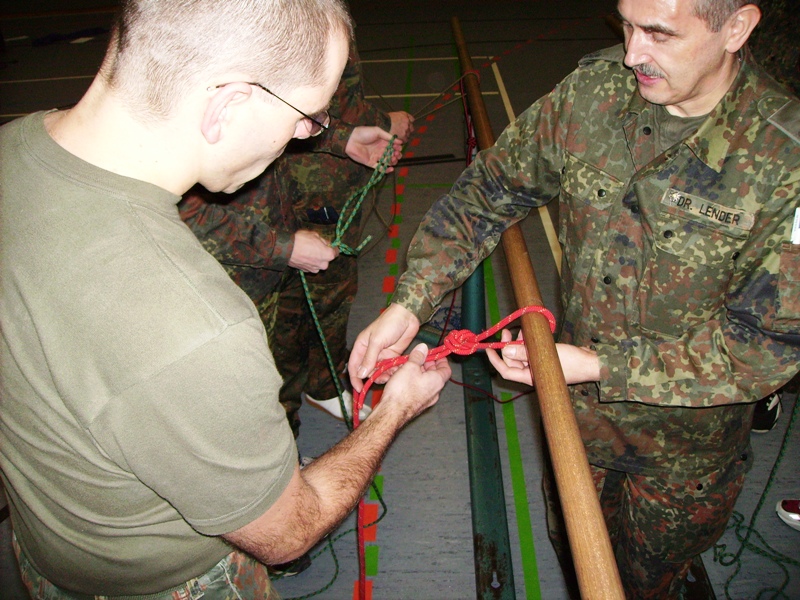 Mastwurf gesteckt und gelegt, Halbmastwurf, Prusikknoten, Sackstich gesteckt und gelegt - so und ähnlich lauteten die Anweisungen, die die Reservisten unter Anleitung auszuführen hatten. Nach ein bisschen Training gelangen die Knoten und das Anseilen bei allen Teilnehmern.