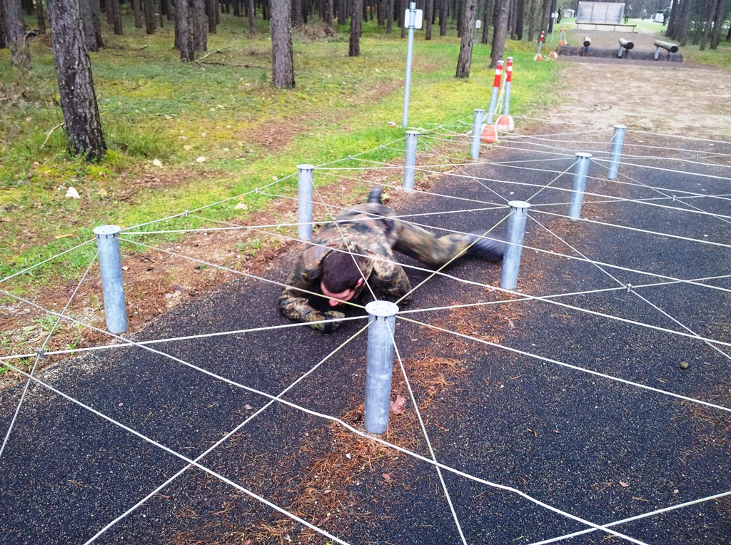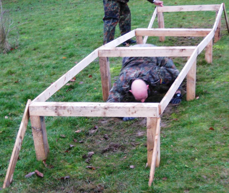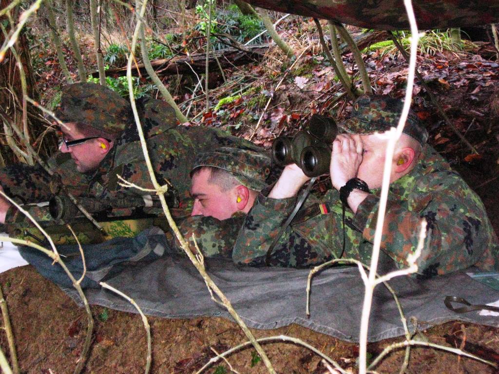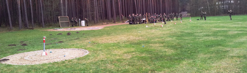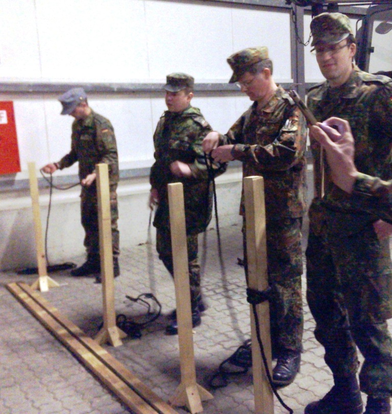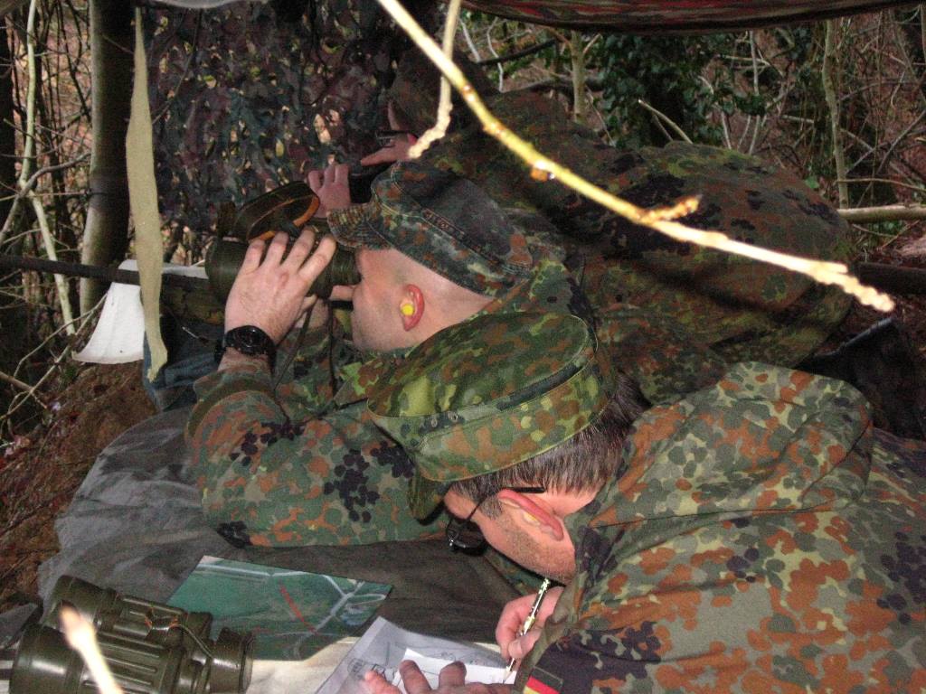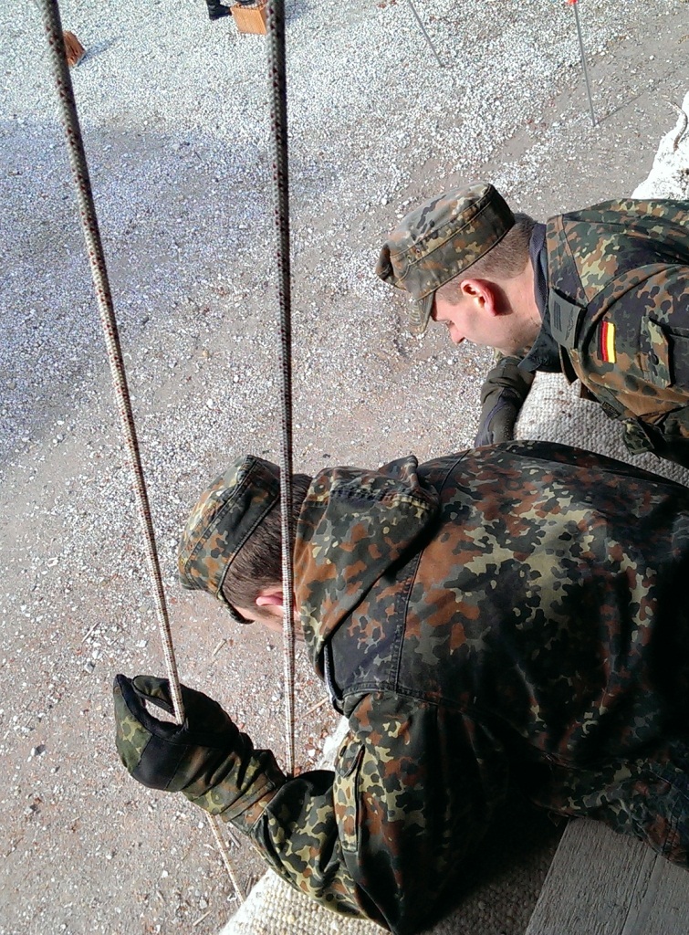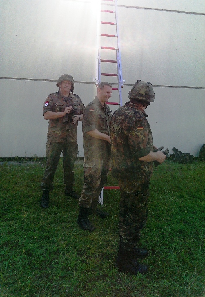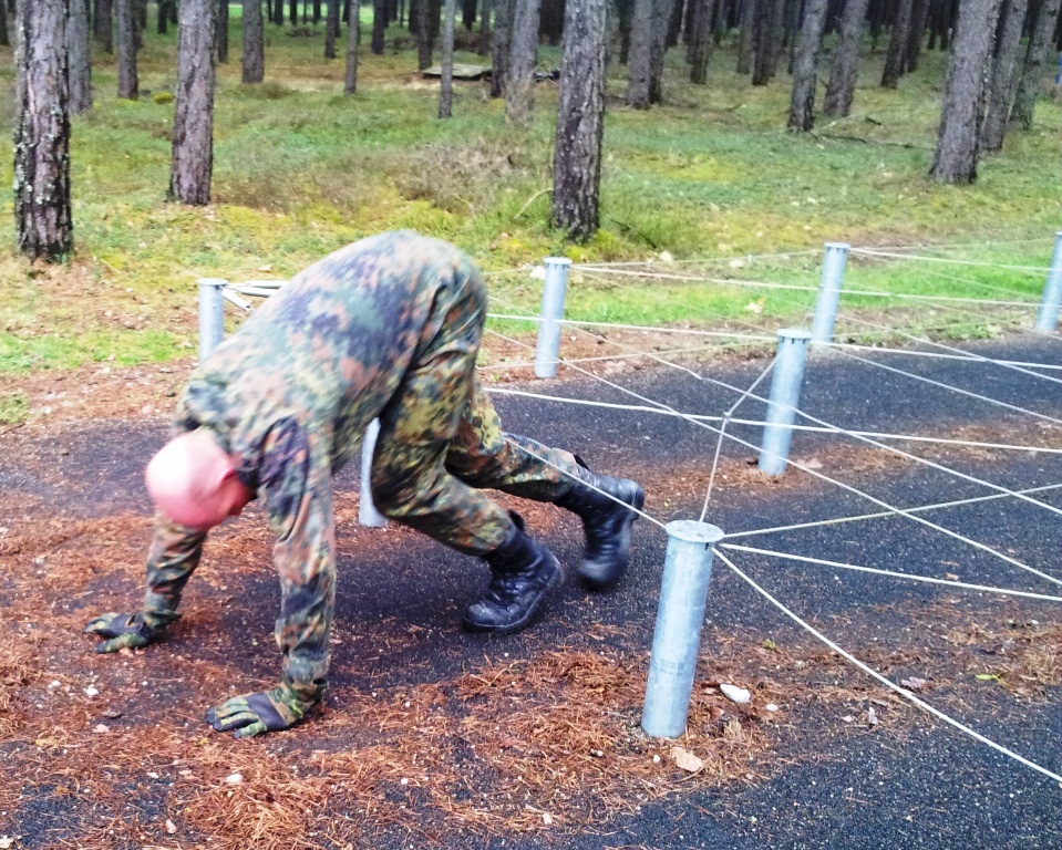 Der Wettkampf startete mit einer Tagphase, in welcher die Soldaten auf die Lage für die bevorstehende Nachtübung vorbereitet werden sollten. 20 Stationen waren im 15-minütigen Takt zu durchlaufen, oftmals viel zu wenig Zeit um alle Aufgabenstellungen an einer Station zu bewältigen. Für uns ging es los mit "Beobachten aus einer Scharfschützenstellung heraus sowie Geländespinne erstellen". Dann folgten verschiedene Schießaufgaben und der doppelte Seilsteg. Am einfachen Seilsteg musste das Wiederaufsteigen nach einem simulierten Absturz gezeigt werden, gar nicht so leicht, aber immerhin zwei aus der Mannschaft haben das geschafft. Bei der improvisierten Hindernisbahn folgte dann der Handgranatenzielwurf. Weiter ging's mit Erkennen von Uniformen und Flaggen, Checkpoints, AGSHP und Feuerlöschen. Letzte Aufgabe war dann die Inbetriebnahme eines Funkgeräts und Absetzen eines verschleierten Funkspruchs.