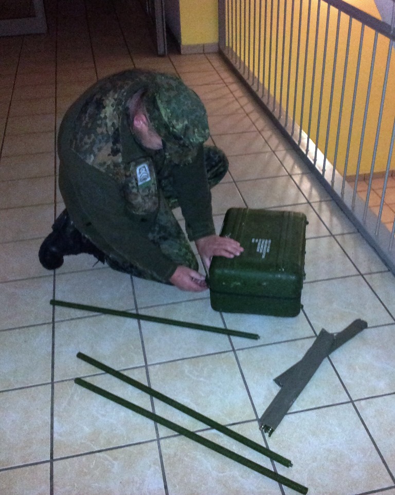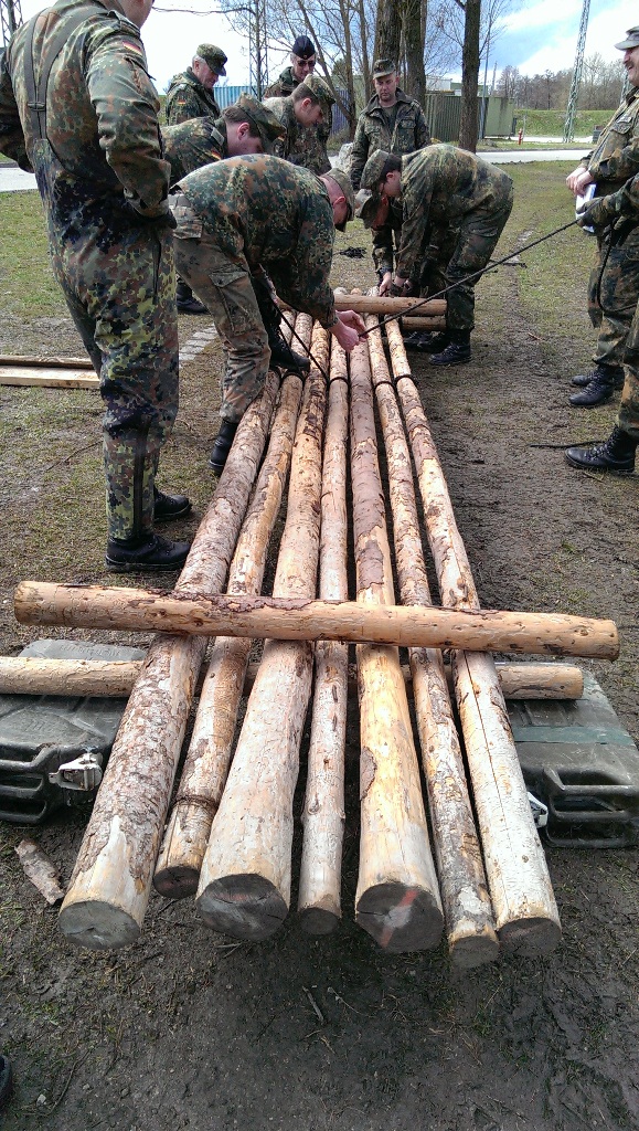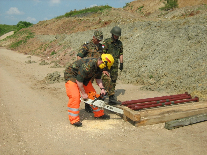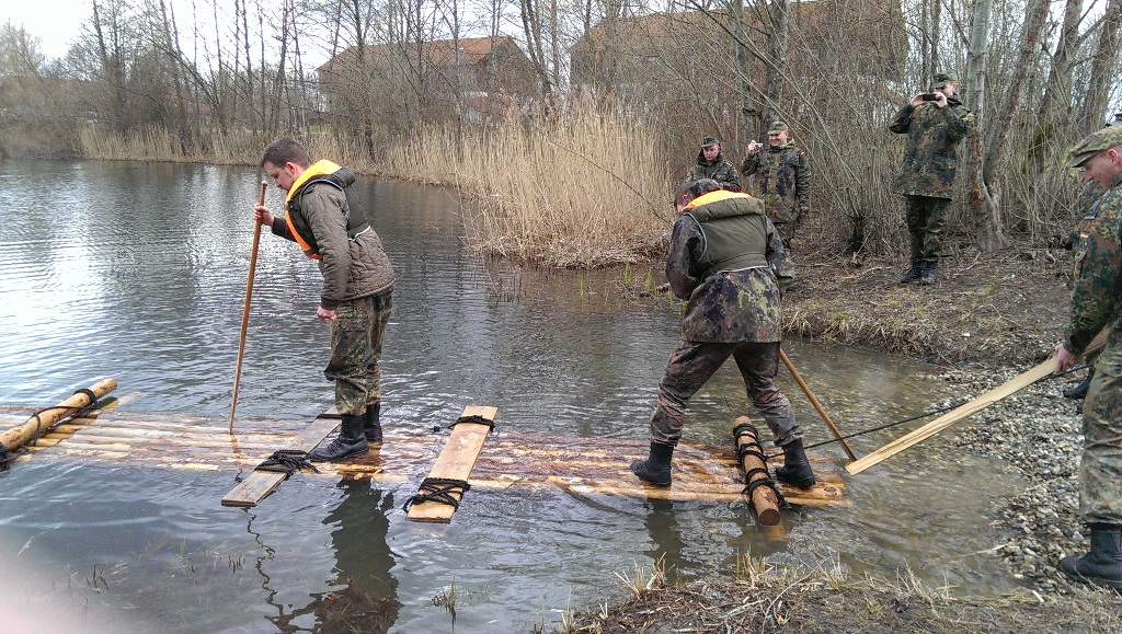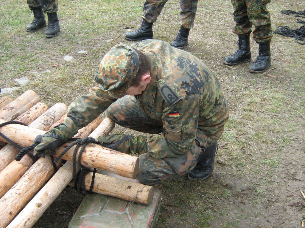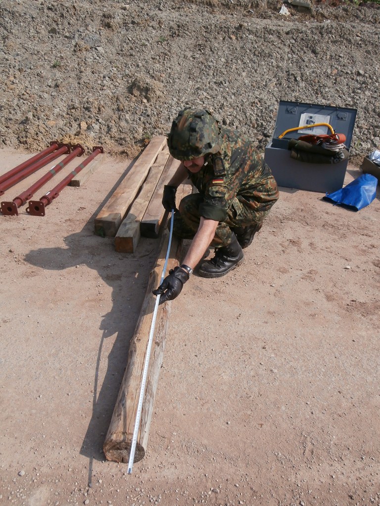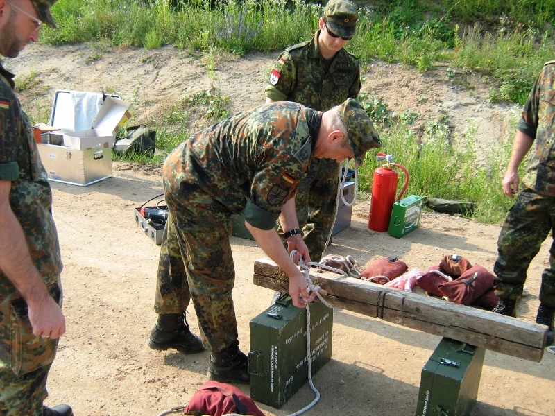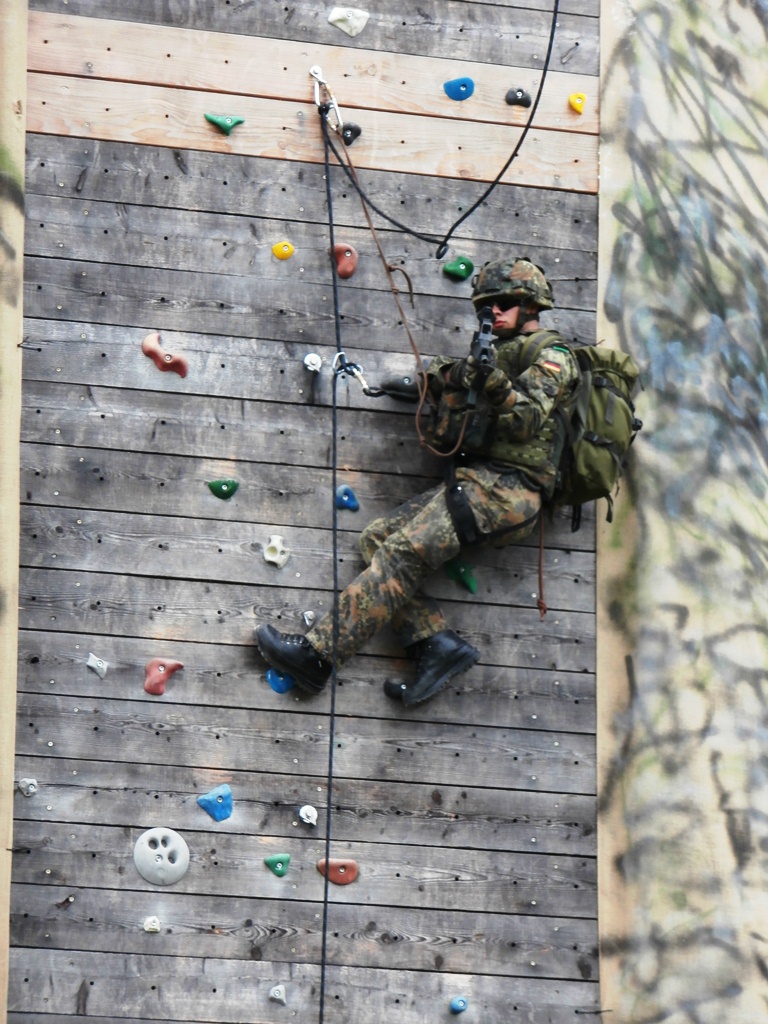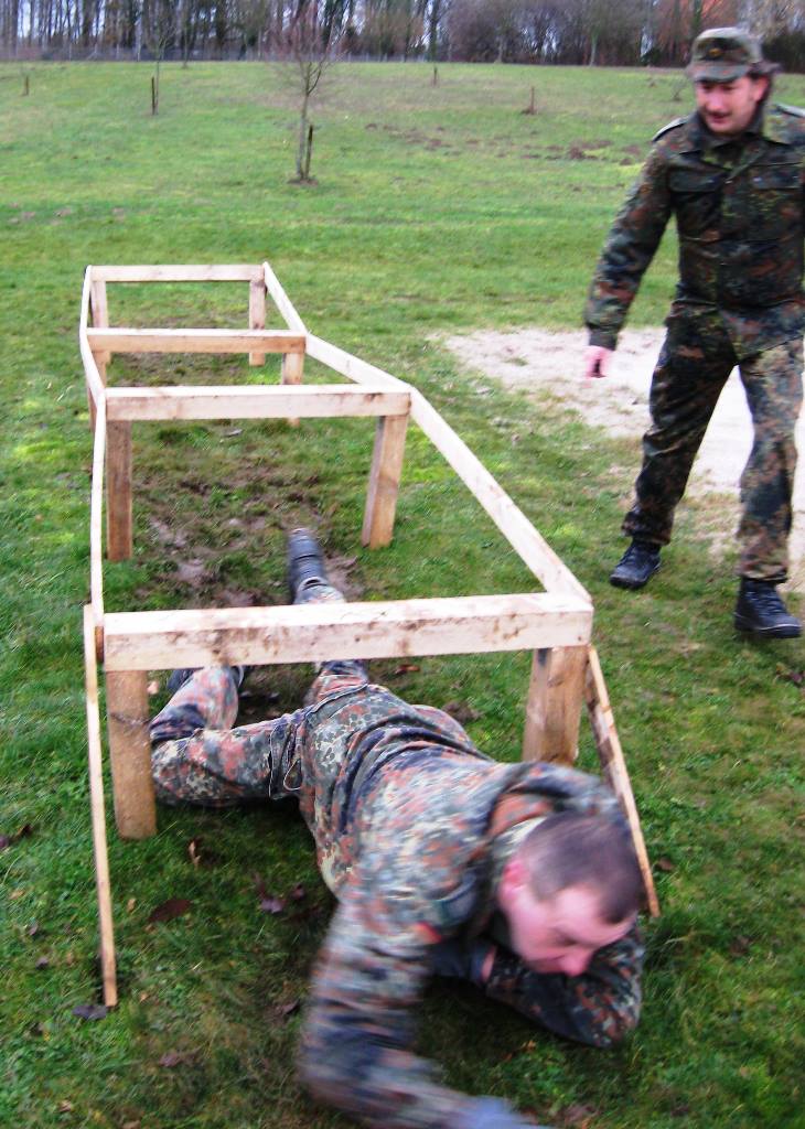 Der Wettkampf startete mit einer Tagphase, in welcher die Soldaten auf die Lage für die bevorstehende Nachtübung vorbereitet werden sollten. 20 Stationen waren im 15-minütigen Takt zu durchlaufen, oftmals viel zu wenig Zeit um alle Aufgabenstellungen an einer Station zu bewältigen. Für uns ging es los mit "Beobachten aus einer Scharfschützenstellung heraus sowie Geländespinne erstellen". Dann folgten verschiedene Schießaufgaben und der doppelte Seilsteg. Am einfachen Seilsteg musste das Wiederaufsteigen nach einem simulierten Absturz gezeigt werden, gar nicht so leicht, aber immerhin zwei aus der Mannschaft haben das geschafft. Bei der improvisierten Hindernisbahn folgte dann der Handgranatenzielwurf. Weiter ging's mit Erkennen von Uniformen und Flaggen, Checkpoints, AGSHP und Feuerlöschen. Letzte Aufgabe war dann die Inbetriebnahme eines Funkgeräts und Absetzen eines verschleierten Funkspruchs.