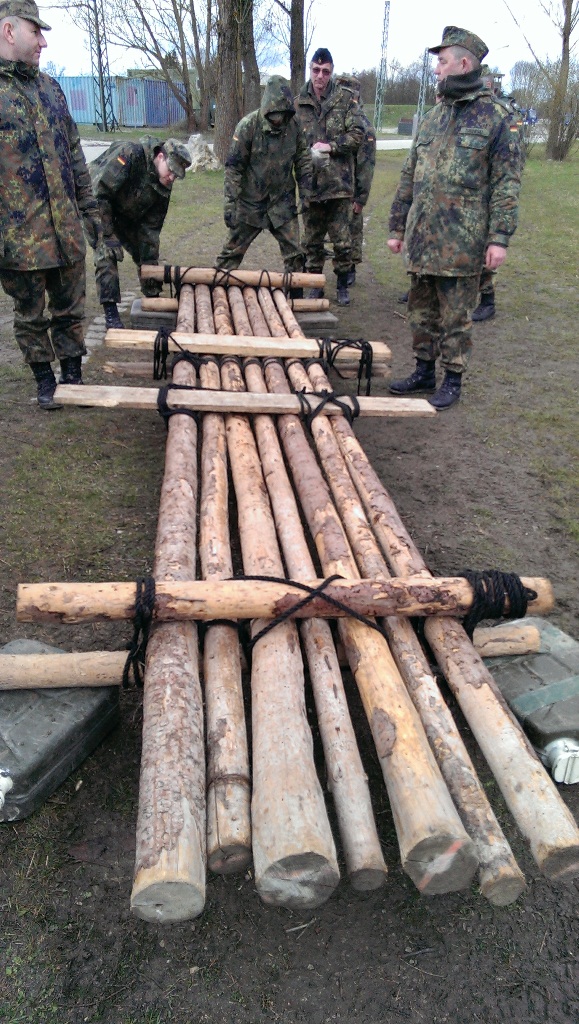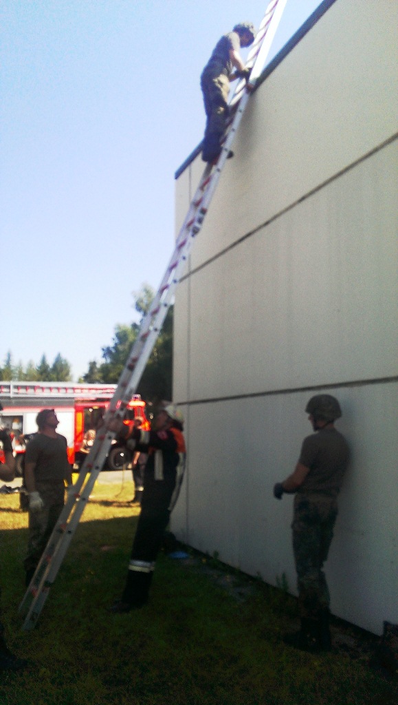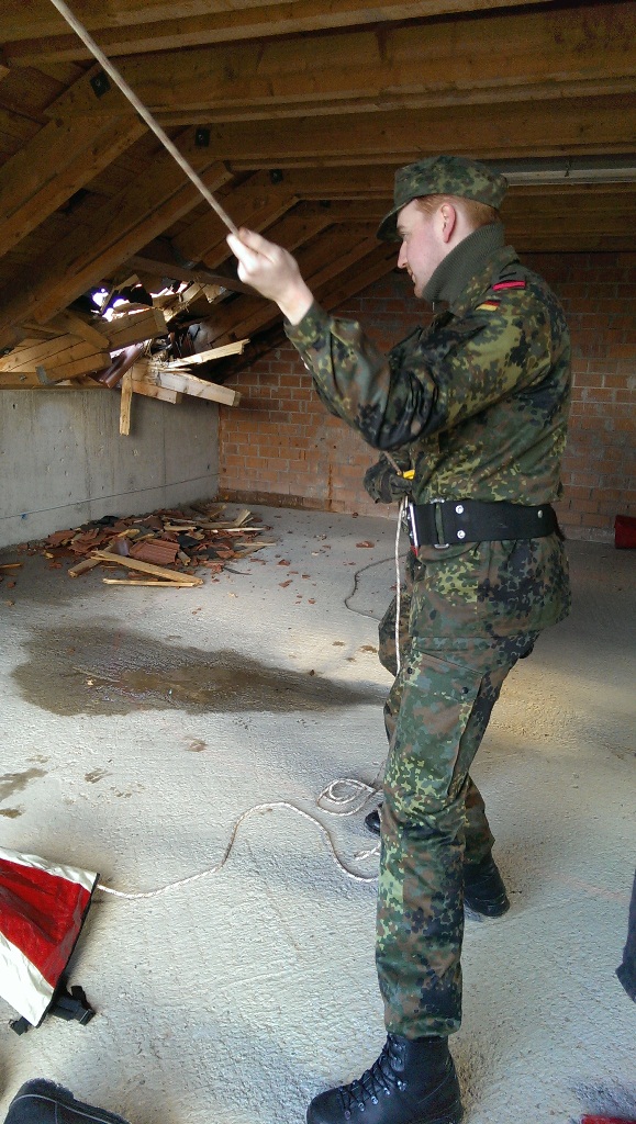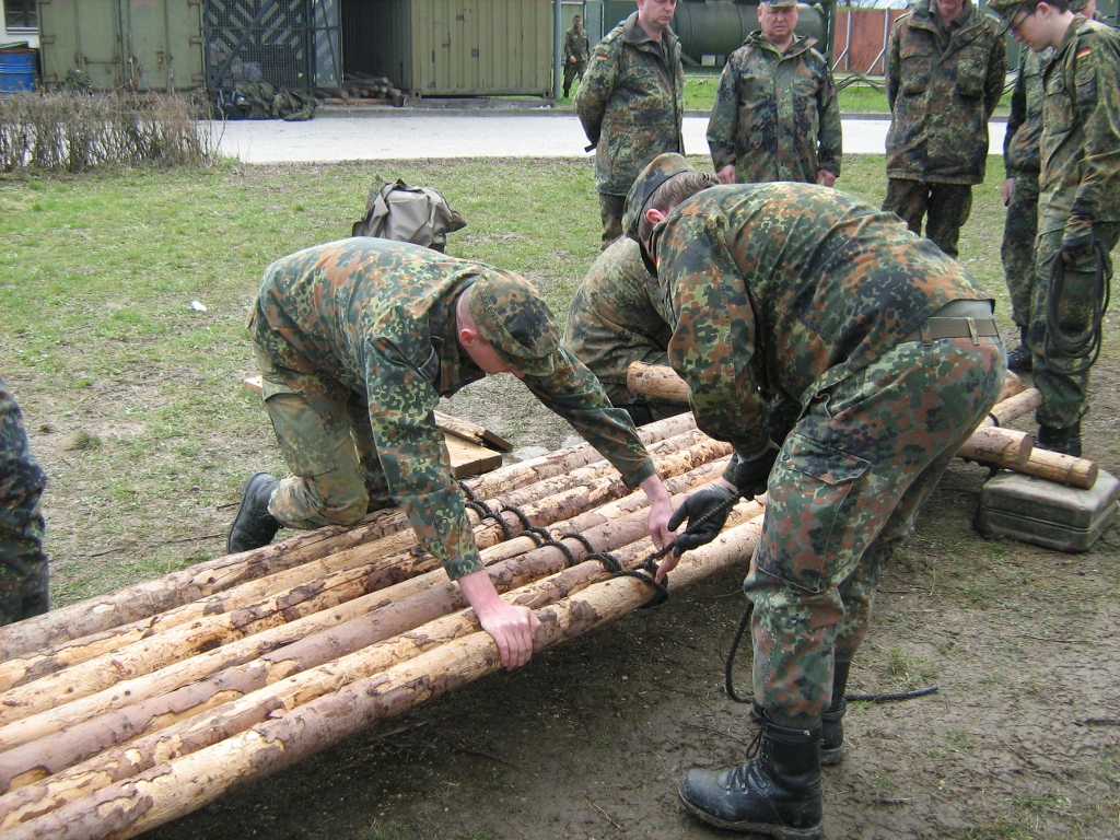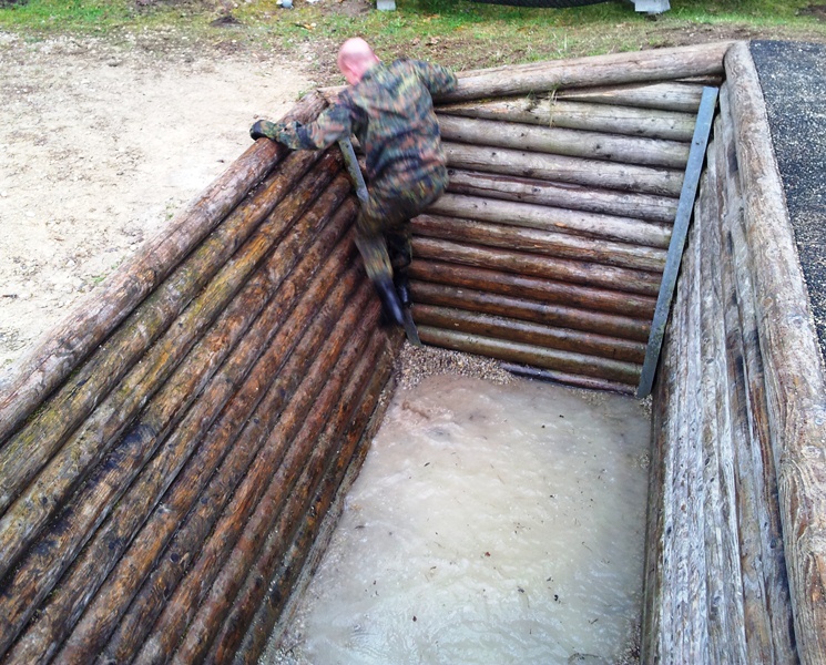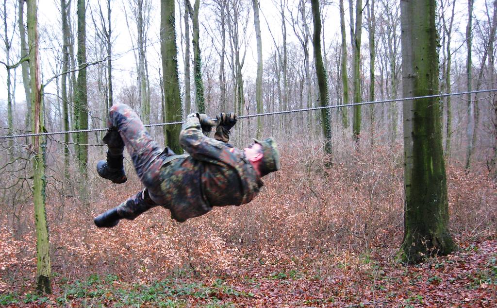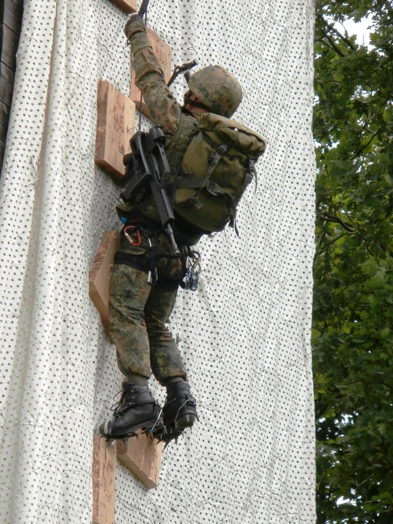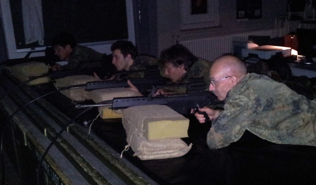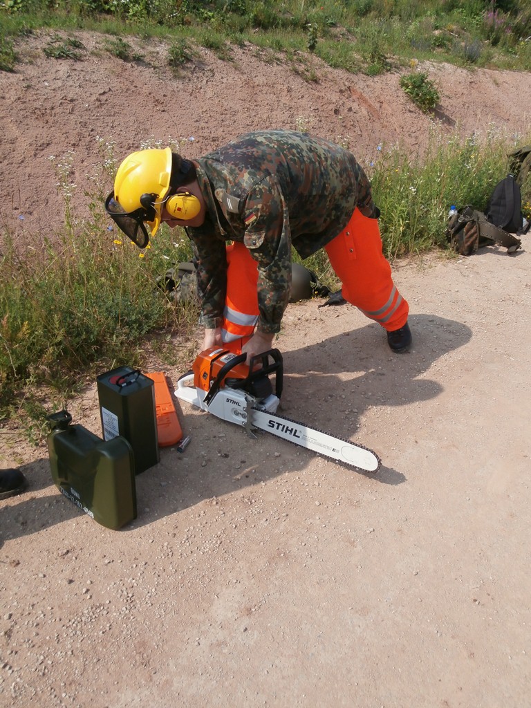 Der Wettkampf startete mit einer Tagphase, in welcher die Soldaten auf die Lage für die bevorstehende Nachtübung vorbereitet werden sollten. 20 Stationen waren im 15-minütigen Takt zu durchlaufen, oftmals viel zu wenig Zeit um alle Aufgabenstellungen an einer Station zu bewältigen. Für uns ging es los mit "Beobachten aus einer Scharfschützenstellung heraus sowie Geländespinne erstellen". Dann folgten verschiedene Schießaufgaben und der doppelte Seilsteg. Am einfachen Seilsteg musste das Wiederaufsteigen nach einem simulierten Absturz gezeigt werden, gar nicht so leicht, aber immerhin zwei aus der Mannschaft haben das geschafft. Bei der improvisierten Hindernisbahn folgte dann der Handgranatenzielwurf. Weiter ging's mit Erkennen von Uniformen und Flaggen, Checkpoints, AGSHP und Feuerlöschen. Letzte Aufgabe war dann die Inbetriebnahme eines Funkgeräts und Absetzen eines verschleierten Funkspruchs.