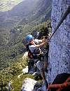 gewählt. "Freies Klettern" entlang des Stahlseils und Nutzung des Steilseils nur als Sicherung war meist nicht möglich,